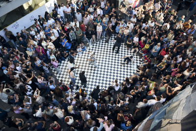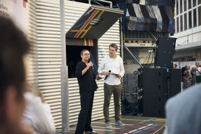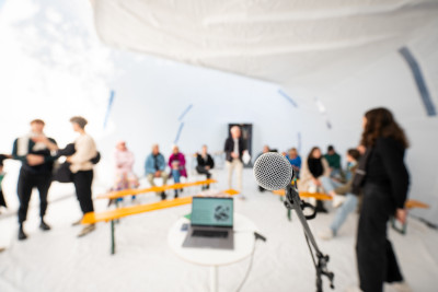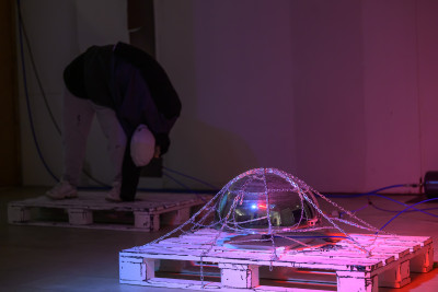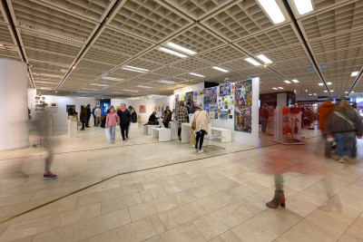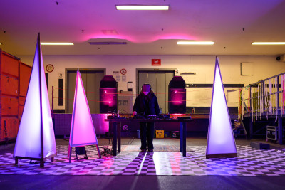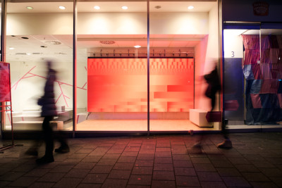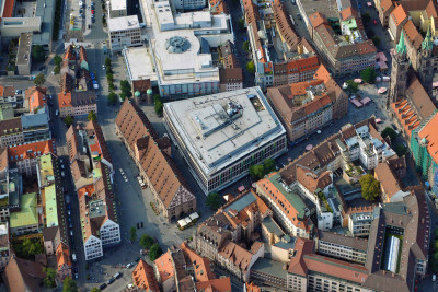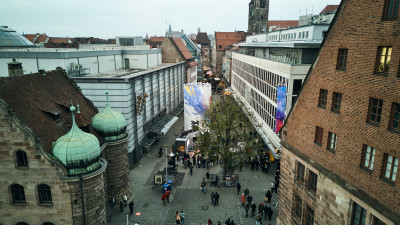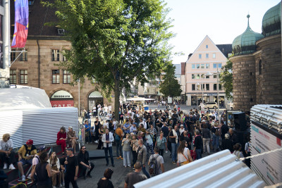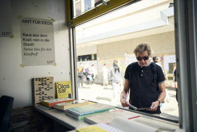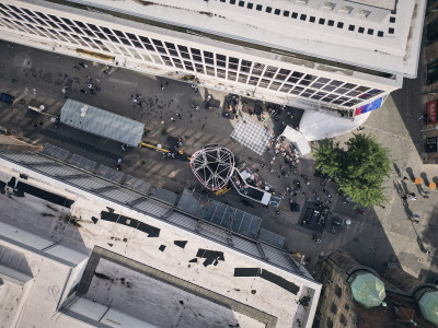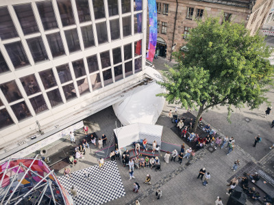 Temporärer Stillstand kann nützlich sein, Bewährtes in Frage zu stellen und sich Neues vorzustellen. 2016 hat raumlaborberlin auf dem Klarissenplatz für das Neue Museum Nürnberg den „Temple of No Shopping“ im Rahmen der Ausstellung „WEtransFORM – Kunst und Design zu den Grenzen des Wachstums“ realisiert. Der Kaufhof in der Königstraße war damals noch aktiv und heute findet man hier, wie in vielen Städten, ein stark verändertes Bild der Fußgängerzonen. Insolvenzen und Leerstände durch die massive Schrumpfung des Einzelhandels überraschen nicht mehr. Kunst und Kultur sollen hier unter dem Motto „Nach dem Einzelhandel: Gemeinsamhandeln“ temporär Raum und Gelegenheit bieten, die Immobilie aus einem anderen Blickwinkel zu betrachten, die Stadtgesellschaft für den Transformationsprozess zu interessieren und zu beteiligen, sich auf die Suche von Visionen für das denkmalgeschützte Gebäude zu begeben. Der „Förderturm“, als Apparatur, erzeugt in regelmäßige Abstände einen pneumatischen Raum, der davon abgekoppelt wird und sich an das ehemalige Kaufhausgebäude anschmiegt, um erste, vorsichtige, räumliche Annäherungen zu ermöglichen.