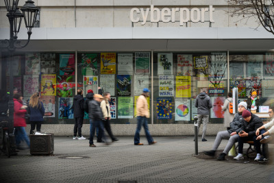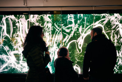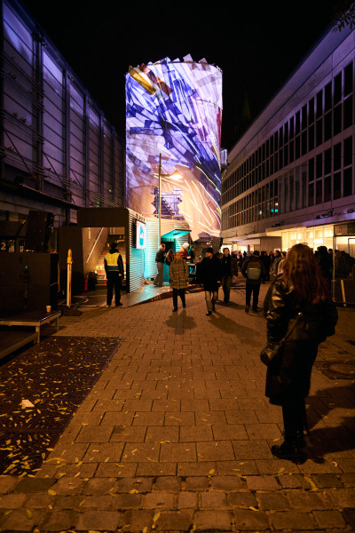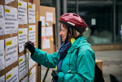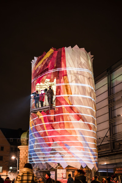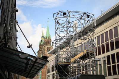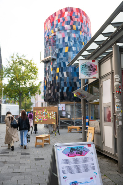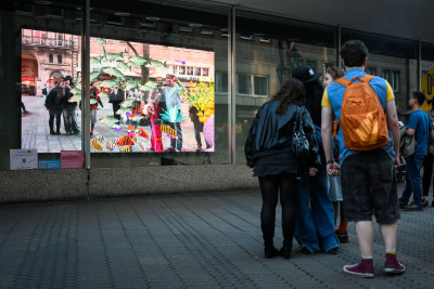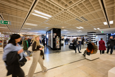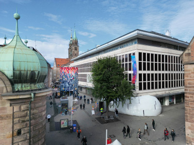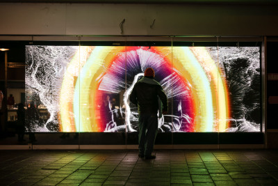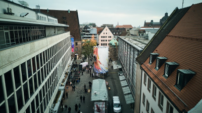 Eine Frau bewundert die Wand mit Pop-up-Kunst von Walli Pop von GEDOK Franken bei der Galerie Kaufhof am Wochenende vom 4. bis 6. April. Foto: Steffen Kirschner