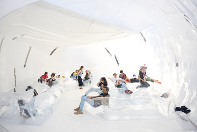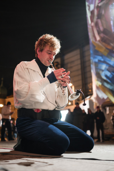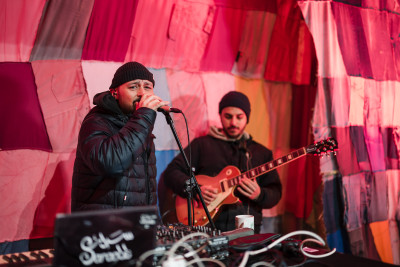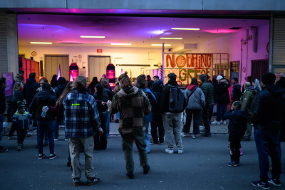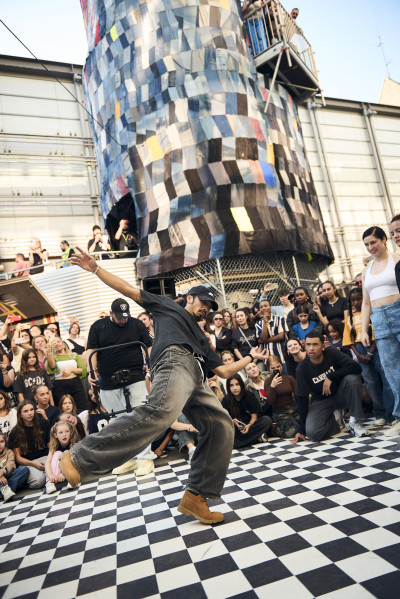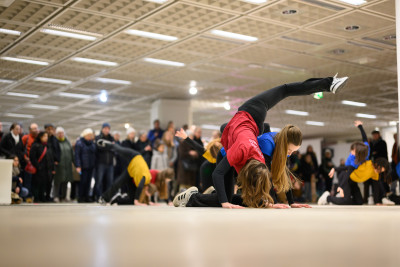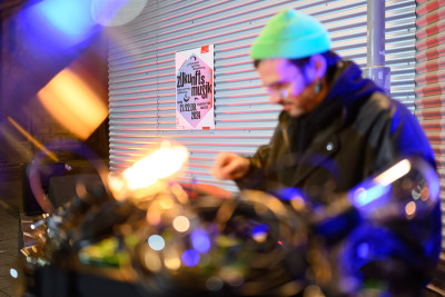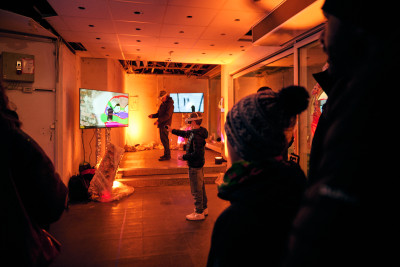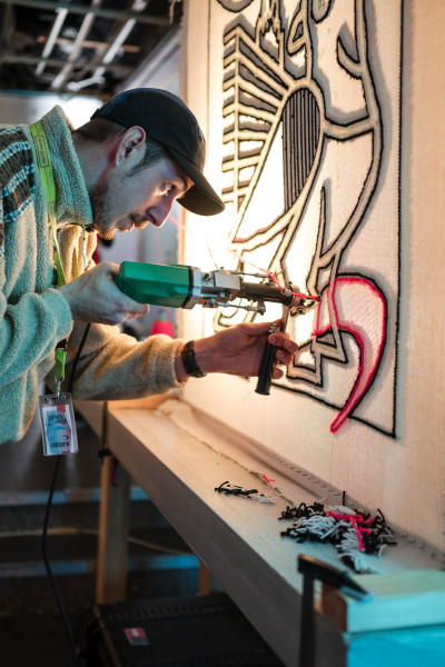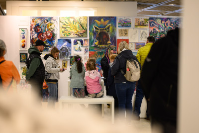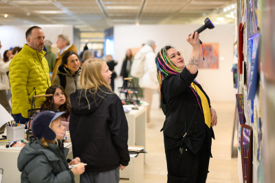 Eine Kunstschaffende von Galerie Edel Extra schafft Kunst, während Besucher*innen zuschauen bei der Galerie Kaufhof am Wochenende vom 4. bis 6. April. Foto: Steffen Kirschner