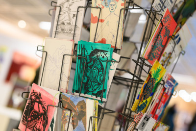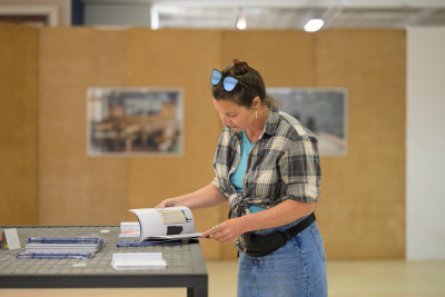 Eine Frau blättert in einer Kunstzeitschrift bei der Ausstellung „Debüt“ der Akademie der Bildenden Künste Nürnberg, 12.05.–17.05.2025. Foto: Steffen Kirschner
