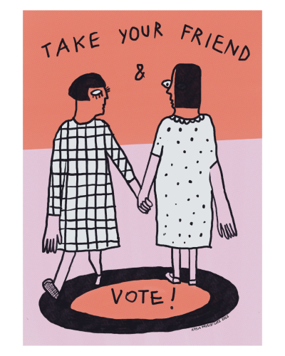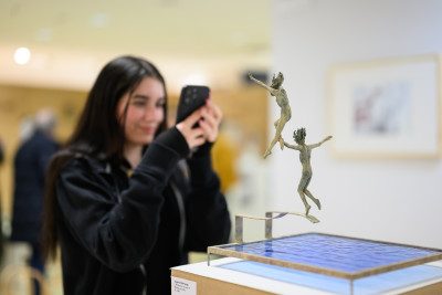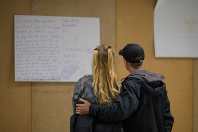 Zwei Besucher*innen schauen sich ein Kunstwerk an bei der Ausstellung „Debüt“ der Akademie der Bildenden Künste Nürnberg, 12.05.–17.05.2025. Foto: Steffen Kirschner