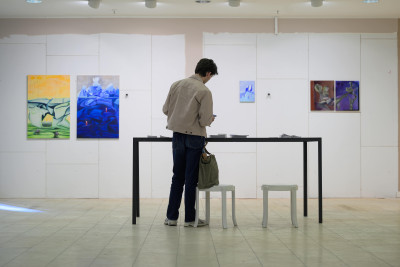 Ein Mann schaut sich vor einer Wand mit Kunstwerken Kunstmagazine an bei der Ausstellung „Debüt“ der Akademie der Bildenden Künste Nürnberg, 12.05.–17.05.2025. Foto: Steffen Kirschner