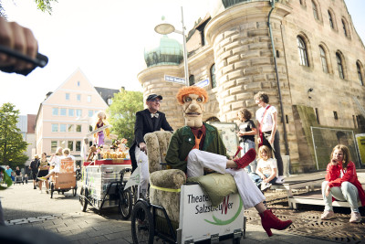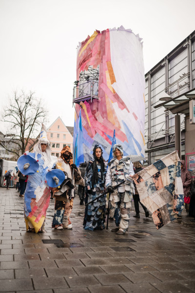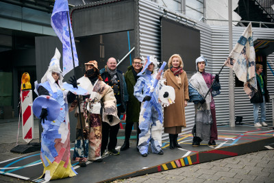 Prof. Dr. Julia Lehner, Dr. Elisabeth Hartung und Raul zusammen mit kostümierten Performer*innen bei der Eröffnung von "Visionen & Utopien" am 16.11.2024. Foto: Julien Fertl