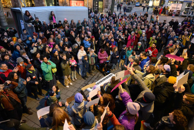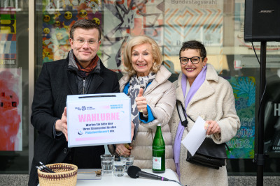 Oberbürgermeister Marcus König, Prof. Dr. Julia Lehner und Dr. Elisabeth Hartung beim Festival der Demokratie am Wochenende des 22. und 23. Februar. Foto: Steffen Kirschner