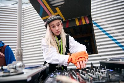 Eine Frau betrachtet ein Kunstwerk mit Tonwiedergabe über Kopfhörer bei der Ausstellung „Debüt“ der Akademie der Bildenden Künste Nürnberg, 12.05.–17.05.2025. Foto: Steffen Kirschner